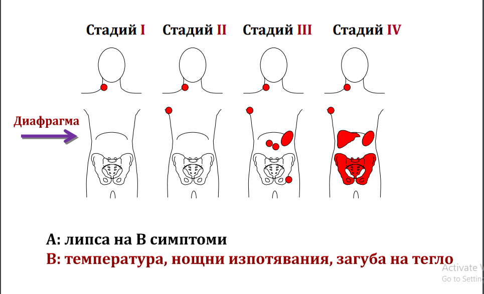 Първи стадий – туморът обхваща една група лимфни възли, при втори стадий – две или повече групи лимфни възли, но разположени само от едната страна на диафрагмата, при трети стадий – групи лимфни възли, разположени от двете страни на диафрагмата, или ангажиране на слезката, а при четвърти стадий(най-напредналият), освен лимфните възли са ангажирани(инфилтрирани) костният мозък и/или различни органи(бял дроб, черен дроб.тестиси,кожа и пр).