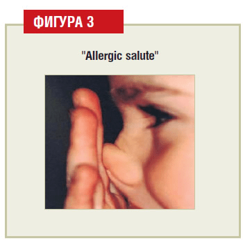 - Т.нар. “алергичен поздрав” (allergic salute) – търкане на върха на носа с длан за облекчаване на сърбежа, в резултат на което се образува напречна гънка през долната трета на носа на прехода на хрущялната част с костния скелет (Фиг. 3).