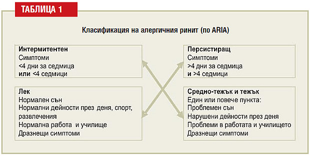 Старата класификация на АР в зависимост от продължителността на алергенната експозиция го разделя на сезонен (сенна хрема) и целогодишен. Според ARIA-2001 (Allergic Rhinitis and its Impact on Asthma), която използва като критерии продължителността и тежестта на оплакванията и въздействието им върху качеството на живот на болните, алергичните ринити се делят подобно на бронхиалната астма на итермитентни и персистиращи (Табл. 1).