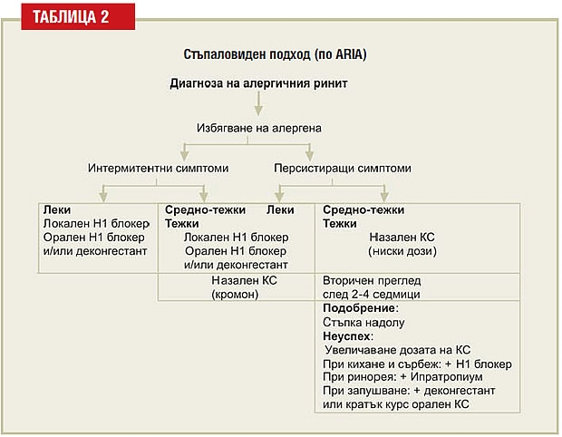 На Табл. 2 е показан стъпаловидният подход при диагноза алергичен ринит.